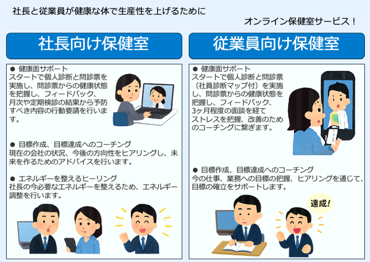 | 参考価格 | 社員5名まで3万円 原則、セッションの回数は増やせません。増やす場合は社員さんと保健室の個人契約を促します。 |